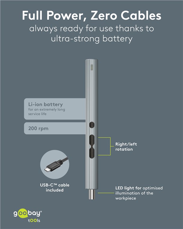 - Cacciavite con connessione USB-C™ per la ricarica, incl. cavo di ricarica da 0,5 m (USB-C™ a USB-A)