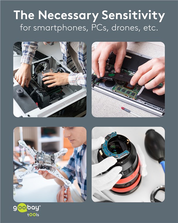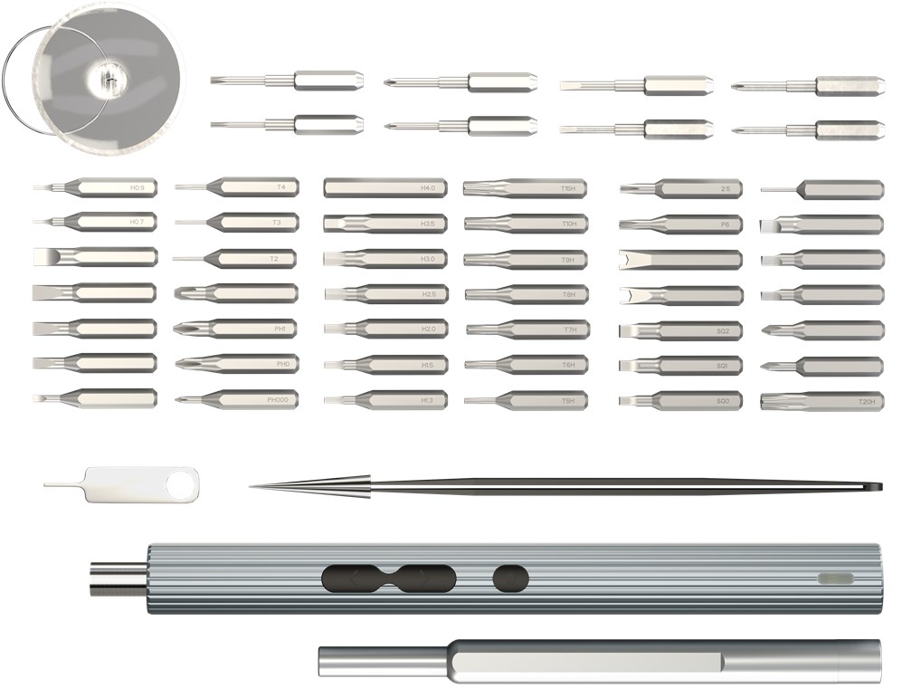 - Il set di cacciaviti comprende: Cacciavite manuale aggiuntivo, ventosa, ago SIM, leva (apri contenitori) e pinzetta ESD-12 a punta per lavori di meccanica di precisione
