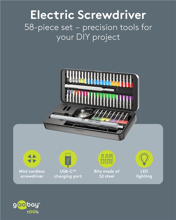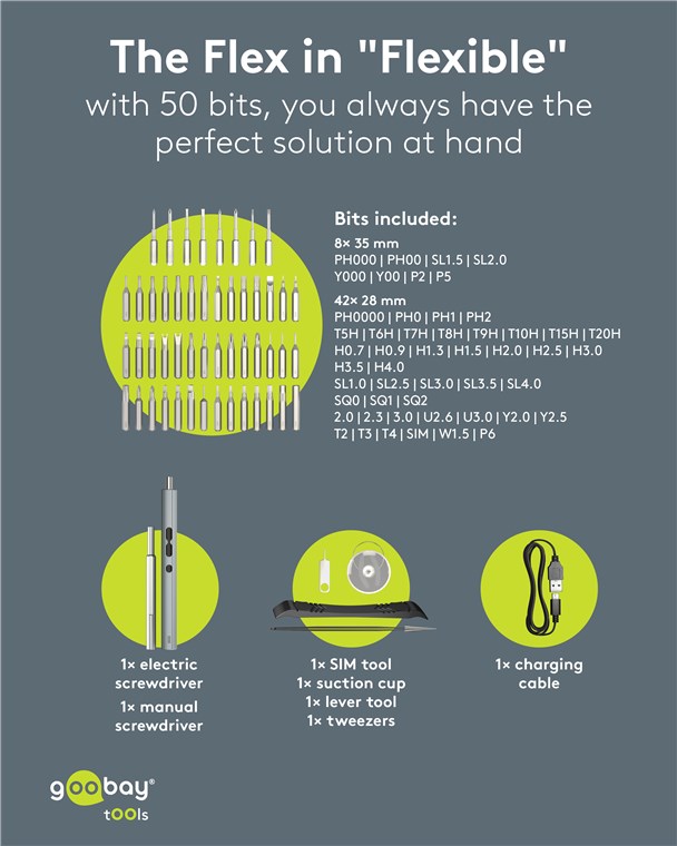 42× 28 mm inserti, 8× 35 mm inserti, Cacciavite manuale & leva, cavo di ricarica USB-C™ a USB-A, Impugnatura per cacciavite con supporto magnetico, pin, pinzetta, scatola portaoggetti, ventosa