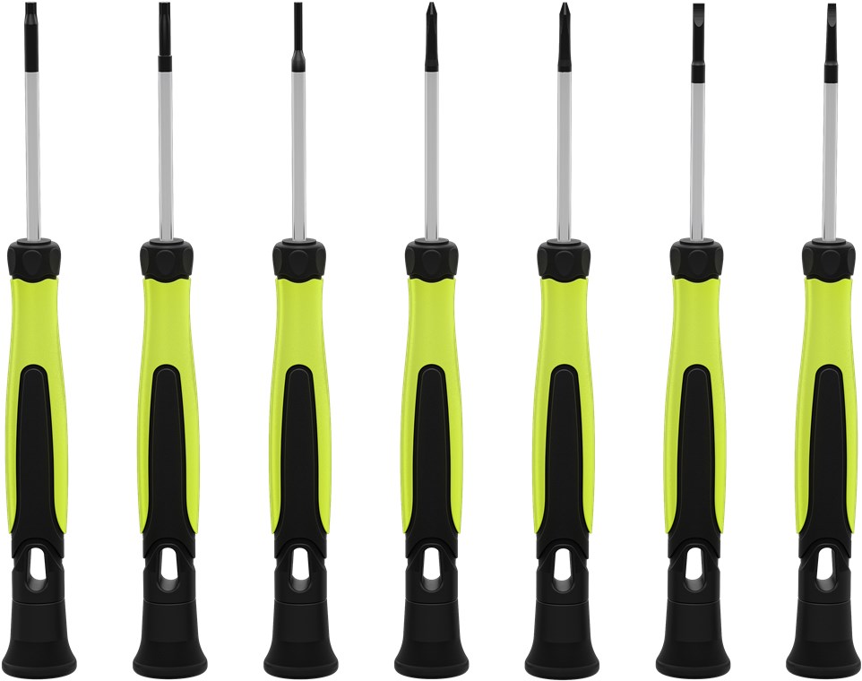7 cacciaviti (2× a taglio (2 mm, 3 mm), 3× a croce (PH0, PH1), 3× Torx (T6, T8, T10)), scatola portaoggetti