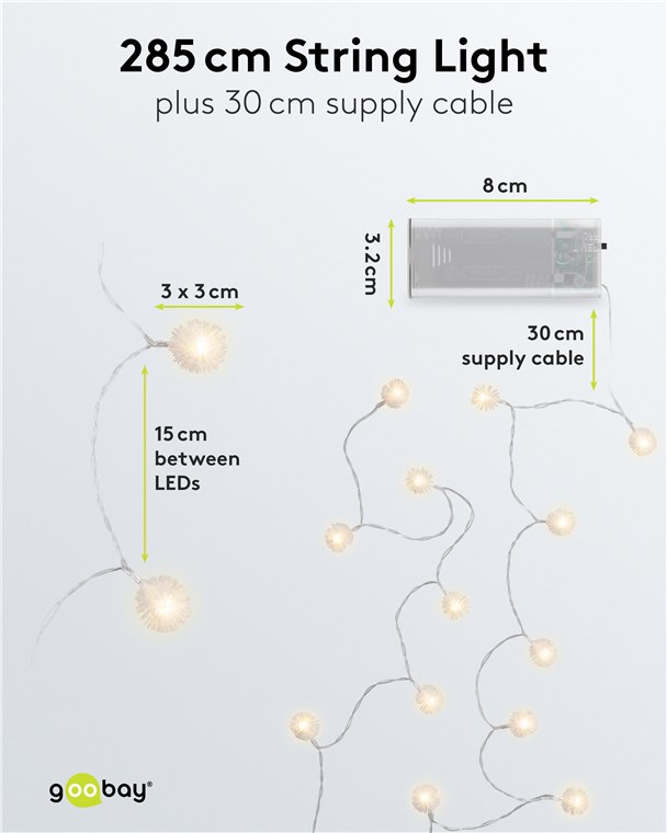 • Długość całkowita: 3,15 m, przewód zasilający: 30 cm, odległość między diodami LED: 15 cm, przewód przezroczysty