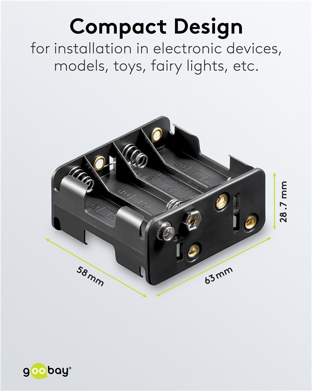- Uchwyt na baterie Goobay może być wbudowany w urządzenie zasilane bateriami lub do niego dołączony.