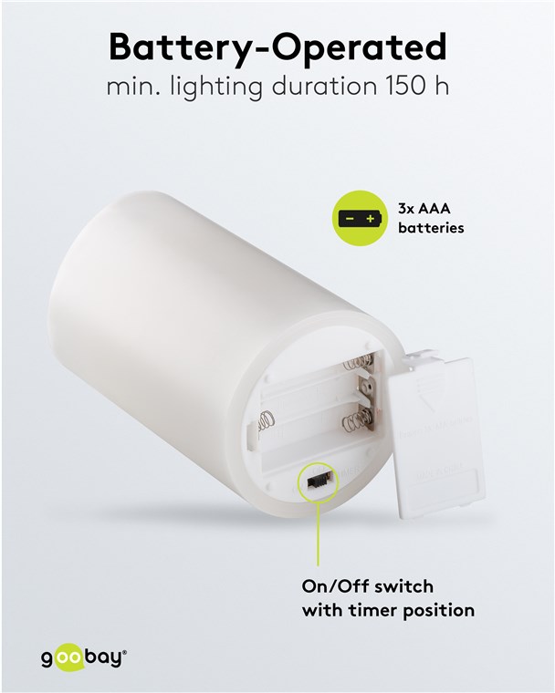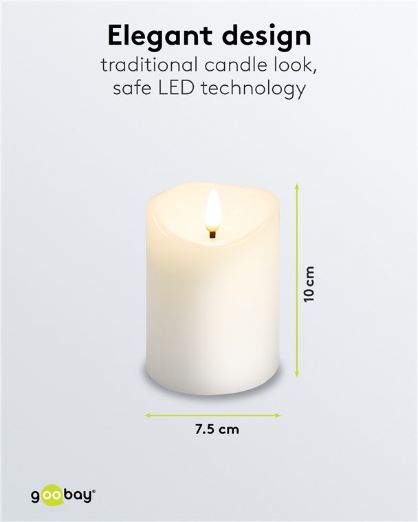 - Wymiary każdej świecy (wys. x szer.): 10 x 7,5 cm, każda świeca LED zasilana 3 bateriami AAA