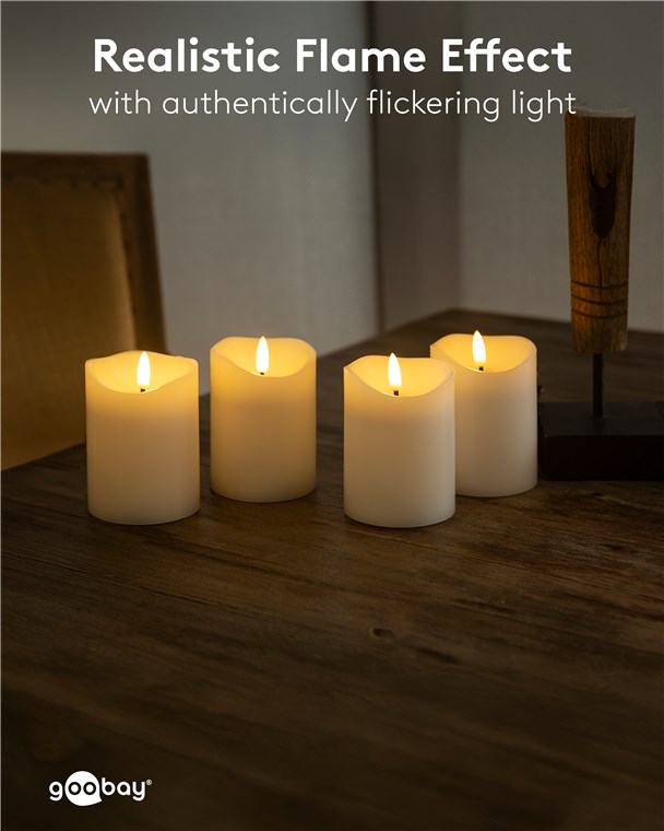 - Cztery świece filarowe w tym samym rozmiarze z wiszącym knotem dla ciepłego światła świec z naturalnie migoczącym płomieniem – całkowicie elektryczne i całkowicie bezpieczne