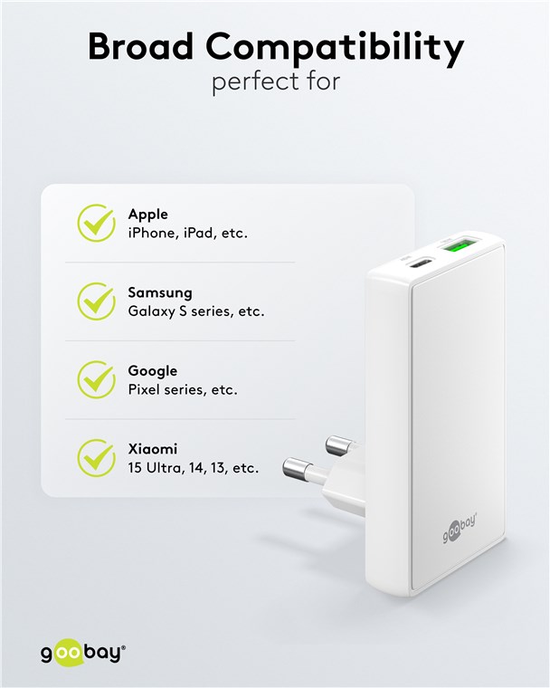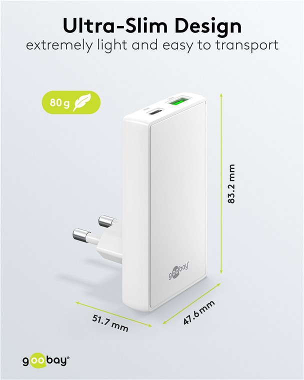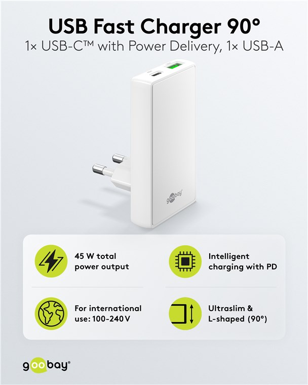 • Dzięki dużej mocy 45 W i uniwersalnemu złączu USB-C™ ładowarka zasila wiele urządzeń, od smartfonów po małe notebooki