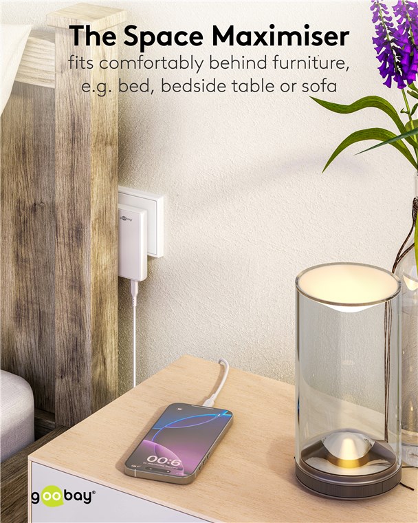 • Po podłączeniu do gniazdka ładowarka USB-C™ jest niewiele głębsza niż listwa przypodłogowa, dzięki czemu zajmuje bardzo mało miejsca – idealnie nadaje się do ciasnych pomieszczeń, np. za szafkami nocnymi i innymi meblami
