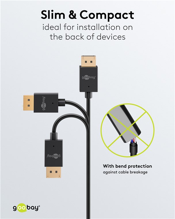 Kabel DisplayPort™ imponuje na trzy sposoby: ultra cienki kabel, ultra krótkie złącza i ultra wąski promień gięcia. Te trzy czynniki sprawiają, że kabel jest idealny do instalacji z tyłu urządzeń i wszędzie tam, gdzie przestrzeń jest ograniczona. Dzięki ultrawysokiej rozdzielczości obrazu 8K zapewniającej ostry jak brzytwa obraz i funkcji wielu monitorów o wysokiej częstotliwości, kabel DisplayPort™ jest idealnym wyborem do wciągających gier i wciągającej domowej rozrywki.