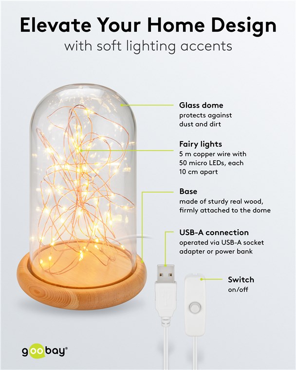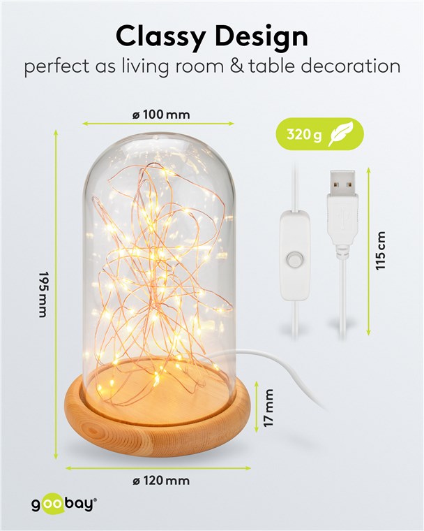 z drewnianą podstawą, kablem USB 115 cm, 5-metrowym łańcuchem świetlnym z 50 mikrodiodami LED w kolorze ciepłej bieli (2700 K) i wyłącznikiem (on/off)
