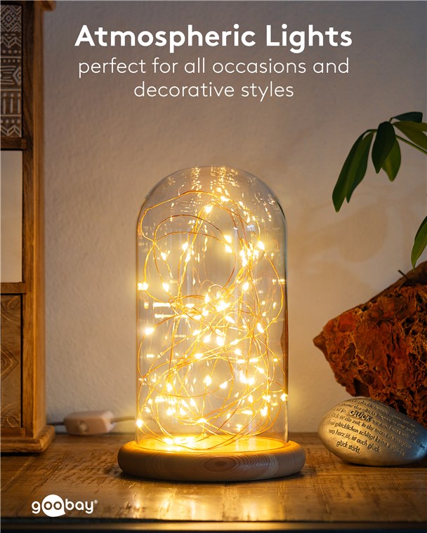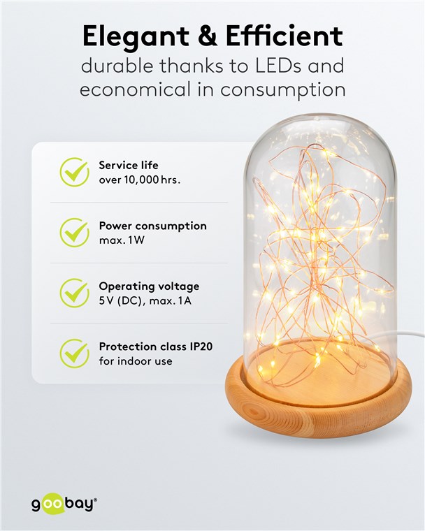 - Szklana kopuła niezawodnie chroni łańcuch świetlny przed kurzem i brudem. Nadaje się do użytku wewnątrz pomieszczeń (IP20).