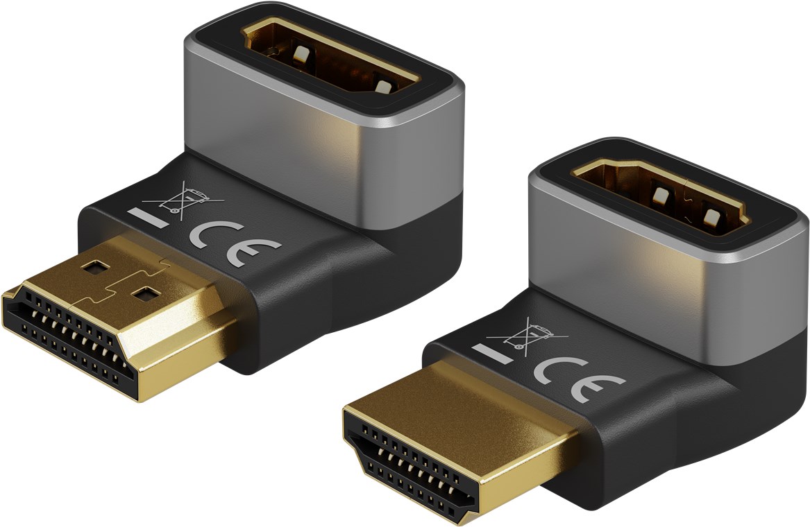 Dwa adaptery. Zero stresu. 100 % jakości dzięki serii Goobay Plus: Dzięki zestawowi 2 adapterów możesz ustawić port HDMI™ pod kątem w górę lub w dół. Jest to szczególnie praktyczne w przypadku dwóch portów urządzeń umieszczonych bezpośrednio jeden nad drugim: po prostu poprowadź kable HDMI™ w różnych kierunkach od urządzenia – idealne rozwiązanie do połączeń oszczędzających miejsce, np. gdy między tylną częścią urządzenia a ścianą jest mało miejsca.