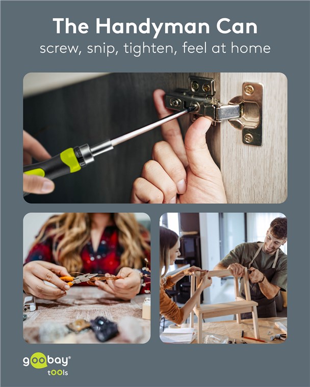 The handyman can: Ten wszechstronny zestaw narzędzi z uchwytem na bity, zestawem bitów, szczypcami bocznymi i śrubokrętami nie może zabraknąć w żadnym gospodarstwie domowym. Niezależnie od tego, czy montujesz meble, wieszasz obrazy, wykonujesz naprawy czy instalujesz lampy, dzięki kompaktowej skrzynce narzędziowej Goobay jesteś doskonale wyposażony do każdego zadania.